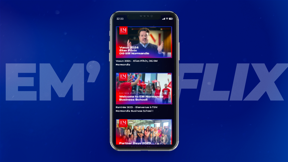 EM’FLIX a pour vocation de centraliser et de mettre en lumière toutes les vidéos réalisées par l’EM Normandie. À travers ces vidéos, nous souhaitons offrir un accès facile et intuitif à un contenu varié et enrichissant, reflétant la diversité et la dynamique de notre communauté étudiante, enseignante et administrative.